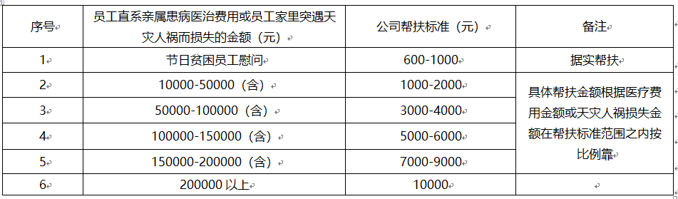 公司福利包括:工作餐补贴、降温费、过节费、健康体检、退休纪念、爱心困难帮扶、员工子女升学奖励、住院探望和慰问、丧事慰问、结婚祝贺、生日祝贺等。 (一)工作餐补助 1、员工每连续工作8小时,公司提供工作餐补助二份(其中:自助早餐2元、自助中餐5元);每连续工作12小时,公司提供工作餐补助三份(其中:早餐2元、中餐5元、晚餐5元)。 2、公司企管部按出勤情况计算职工工作餐补助总额,次月随工资一并发放。 (二)降温费或降温物资 1、遇高温天气,公司为员工免费提供降温物资和防暑药品。 2、公司除向员工提供降温物资和防暑药品外,还给在岗员工发放降温费(或降温物资)。降温费按6、7、8、9四个月发放,标准由公司办公会确定。机关、车间、高温岗位、室内(外)岗位等适当区别。 3、降温费发放以人员在岗为原则:当月在岗15天(含15天)以上的,享受全月降温费;不足15天的,不发降温费。 4、降温费发放时间:具体发放时间详见公司通知为准。降温费由企管部造表,财务部发放。 5、公司亦可酌情发放部分降温物资。 (三)过节费或过节物资 春节、端午节、中秋节、三八妇女节(仅对女性员工)公司给员工发过节费或过节物资。发放方式、具体数额由公司经理办公会开会决定,以公司通知或纪要为准。 (四)住院探望和慰问 1、非因工伤住院 凡公司员工本人因病住院治疗(含按计划生育政策住院生育的),公司派人探望和慰问,标准为慰问金300元,或等值慰问物资。由员工所在部门(车间)负责前去探望,并办理有关核销手续。 2、因工伤住院治疗 公司员工因工伤住院的,由员工所在单位的负责人、所在作业区作业长(班组长)一起前往医院探望和慰问,标准为慰问金400元,或等值慰问物资。由所在单位负责办理有关核销手续;公司员工因工伤住院的、住院时间在15天以上、或重伤的,由公司领导代表公司前往医院探望和慰问,标准为慰问金500-2000元。具体由企管部负责安排并办理有关核销手续。公司领导可以是公司总经理、党委书记、分管副总经理或工会负责人。 (五)结婚祝贺 在职期间依法办理结婚登记的员工,公司表示祝贺,发放礼金500元。礼金由员工所在的部门(车间)、工会小组办理有关核销手续。 (六)丧事慰问 员工的父母、配偶及子女亡故的,公司表示哀悼和慰问,标准为慰问金 500元,公司名义送花圈一个。慰问金由员工所在的部门(车间)、工会小组、党支部办理有关核销手续。委派人选及车辆申请由员工所在部门(车间)负责。 (七)健康体检 公司每年组织员工体检一次(不含试用期员工),特殊岗位和工种每年职业健康体检一次。体检的策划、实施由公司企管部负责。具体见公司体检通知。 (八)爱心帮扶 员工的直系亲属(指父母、配偶、子女)患重大或长期疾病、伤亡、突发或遇到天灾人祸等,员工本人的经济承受能力确有困难的,可以向公司申请资助。帮扶标准原则如下: ![]() (九)员工子女升学奖励 员工的子女考上三类本科及以上院校(以通知书为准,含保送)的,公司给予奖励。 1、被国家一类大学本科(主要指教育部直属或其他主要部属以及部分省属重点大学,一般多为“985”工程或“211”工程院校)录取的奖励人民币4000元;被国家二类大学本科(主要指省属大学或者非“211”工程院校)录取的奖励人民币3000元;被国家三类大学本科(指独立学院本科院校或公办民助范畴的本科院校)录取的奖励人民币2000元。公司对院校类别区分以院校本身性质定性,不以录取批次定性。 2、若为地级城市(或以上)文科、理科状元的,或为全省文科、理科状元的,或有其他特别需要奖励的情况,由公司专题会议讨论是否奖励和奖励金额。 3、员工家庭同时有多名子女考取大学的,按以上规定分别享受奖励政策。 4、员工子女考取研究生、博士等不在奖励范围。 5、其它未尽情形由公司根据实际情况讨论决定。 (十)生日祝贺 在岗员工30、40、50岁、60岁(男员工指虚数,女员工指周岁),公司表示祝贺,赠送生日蛋糕一份。由员工本人在企管部领取蛋糕票,到指定的蛋糕店领取蛋糕。 (十一)退休纪念 员工符合退休政策和年龄退休,公司企管部安排欢送会,并送价值500元纪念品一份。由企管部负责办理有关手续。 |